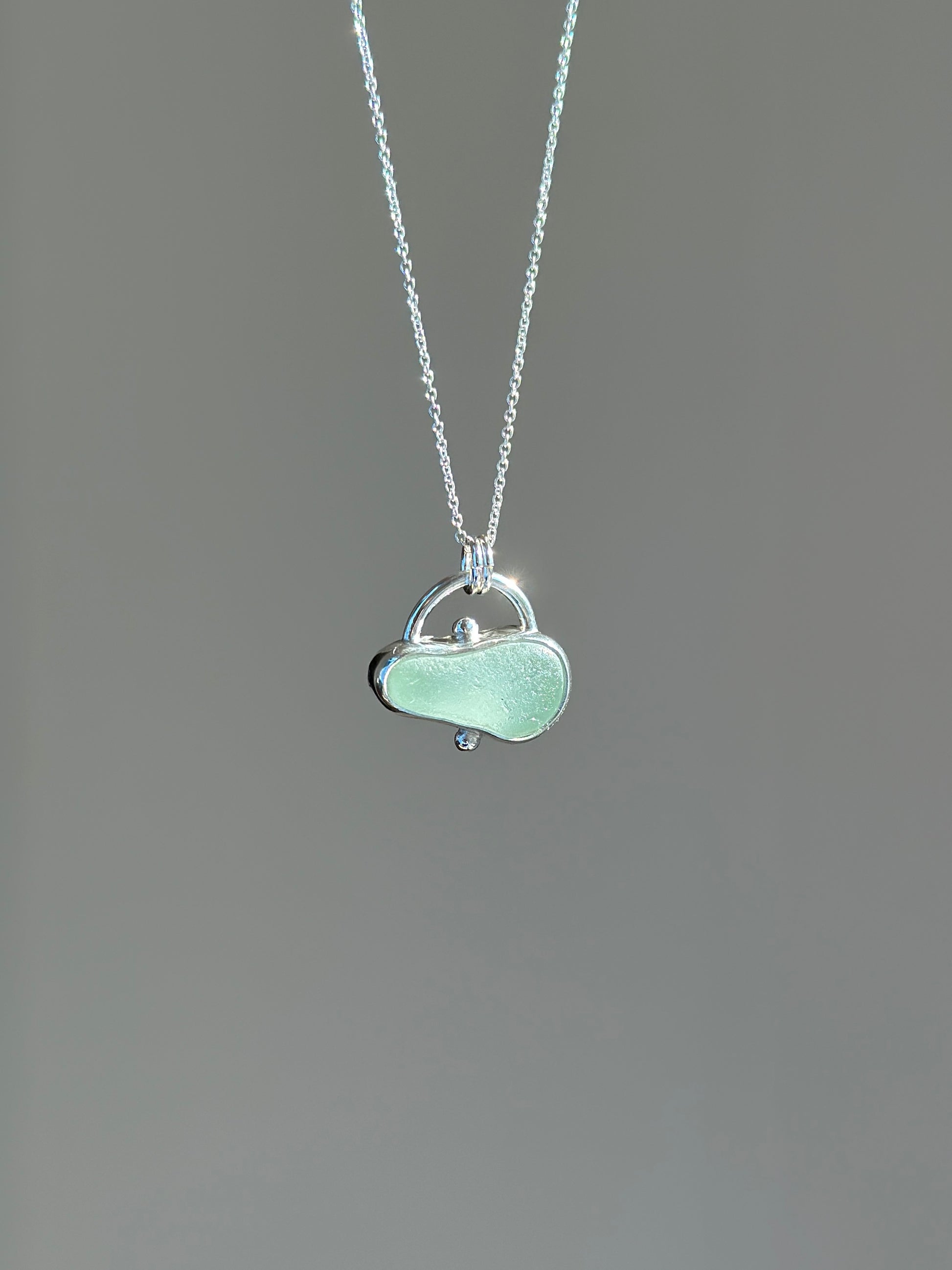 This piece of aqua (blue/green) sea glass was carefully wrapped in 100% sterling silver and set on a sterling silver backplate with a double jump ring bail and recycled scrap silver embellishments.