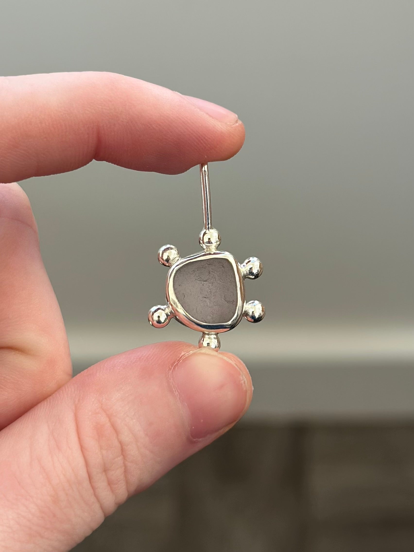 This piece of light purple sea glass was carefully wrapped in 100% sterling silver and set on a sterling silver backplate with recycled scrap silver embellishments.